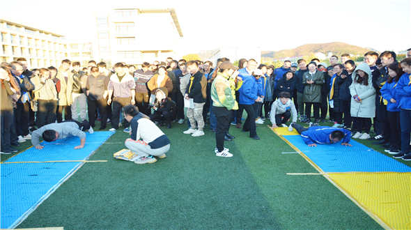 10月底的天气虽有些寒意料峭,但比赛现场激情飞扬,各参赛队之间你追我赶,竞争激烈。八个项目依次进行,比赛高潮迭起,欢笑声和加油声交织在一起,令人欢欣鼓舞。八个项目中最精彩的要数运动会压轴戏“指压板接力”。“网红”指压板可谓大名鼎鼎,但许多参赛队员只在各种综艺节目中见过,赛前有人对它不屑一顾,但当真正脱下鞋子与它亲密接触后,才感受到它的“威力”。比赛每队四人一组,第一名运动员在指压板上跳绳,跳满20个接力给第二个运动员,第二名运动员在指压板上作俯卧撑,做满20个接力给第三人,第三名运动员在指压板上手脚并用爬行10米,传递给最后一名运动员,最后一个人额头上放一枚饼干,在指压板上冲刺同时保证饼干不掉,第一个冲过终点的队伍获胜。伴随着脚下的一阵阵“电流”,参赛运动员们争先恐后“痛并努力着”,拉拉队的欢呼呐喊声也将本次趣味运动会推向一个小高潮。